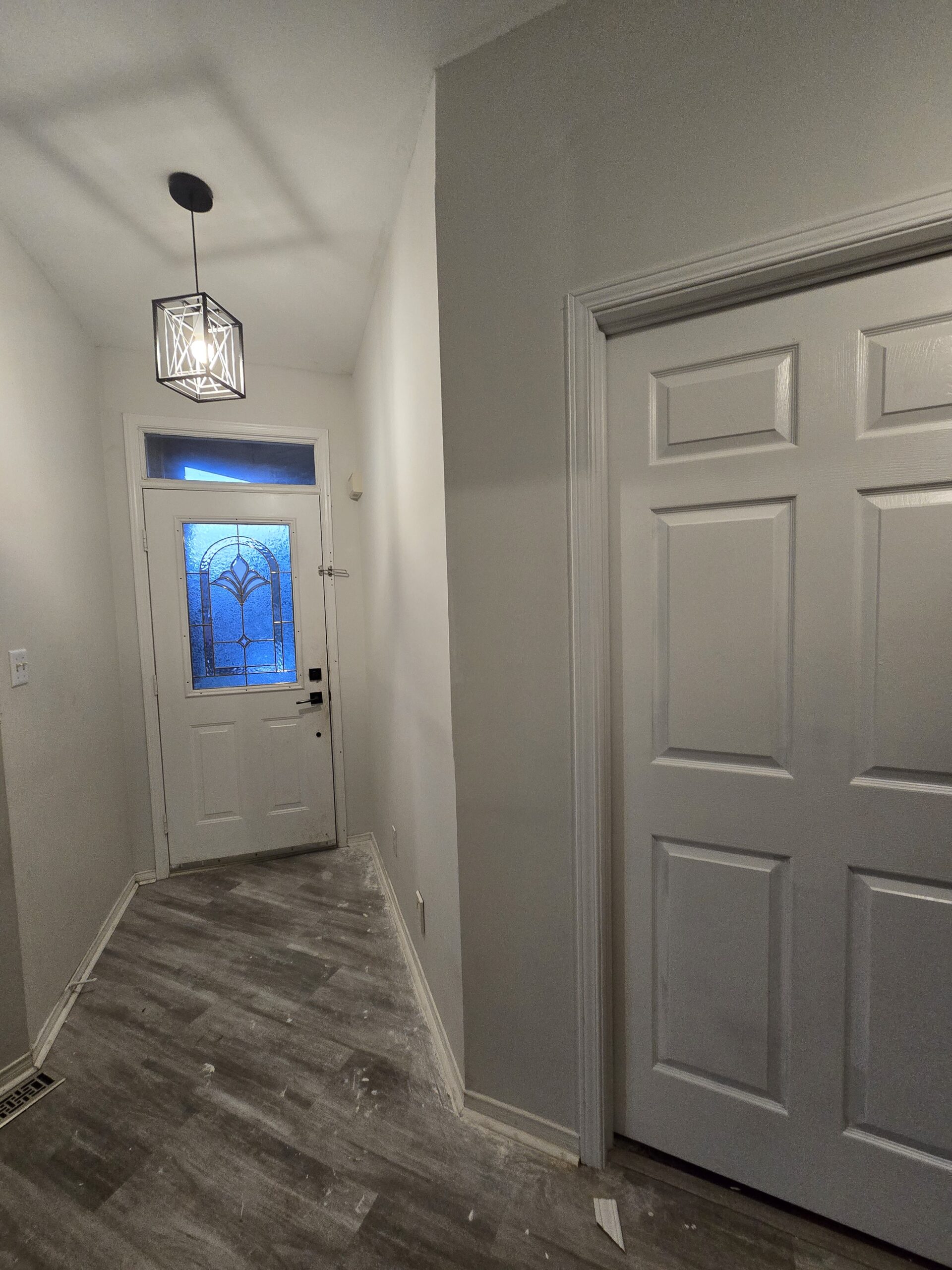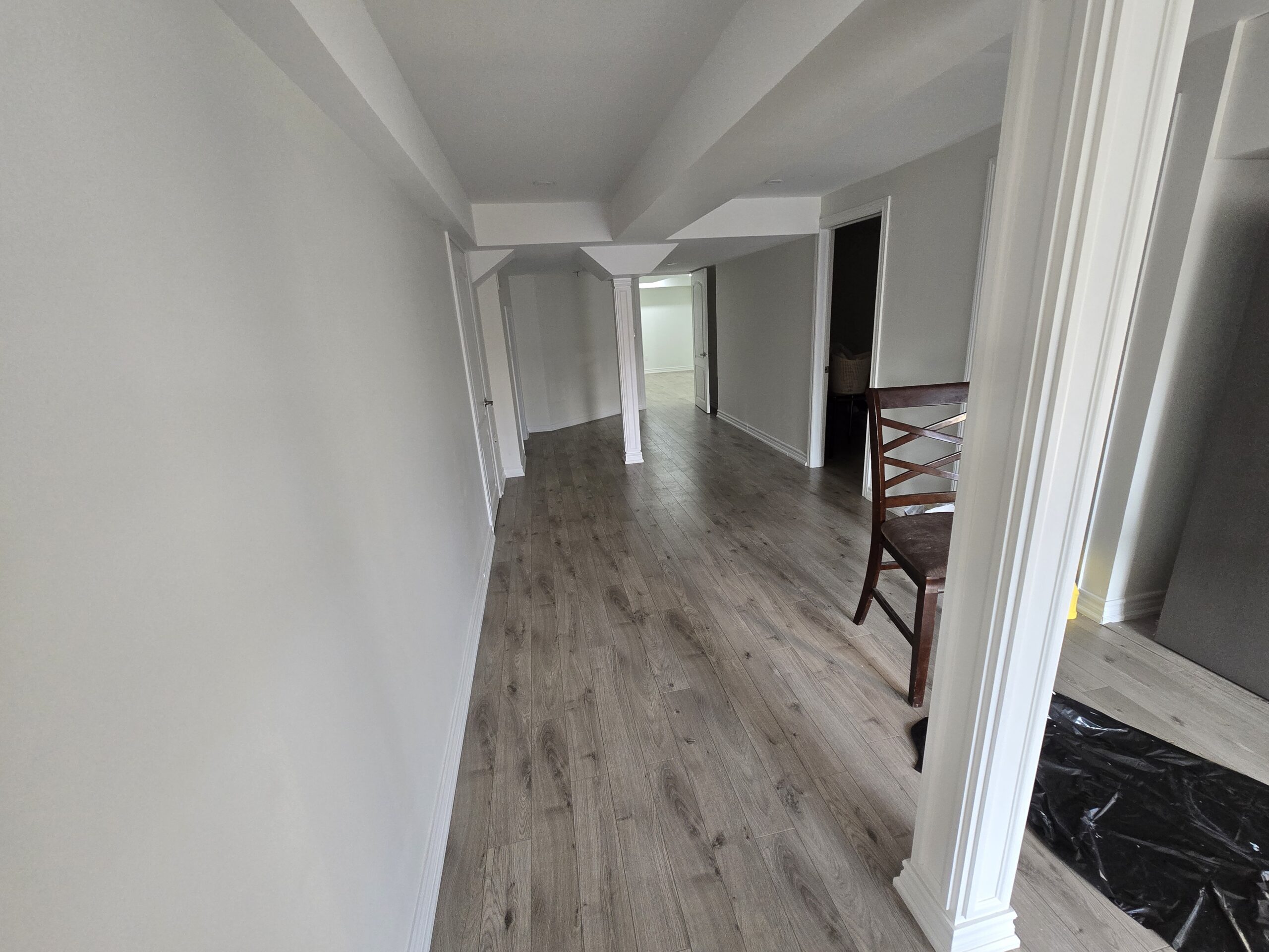 Complete basement Renovation featuring two doors on either end, a weight-bearing post covered in drywall, and a smooth paint finish.
