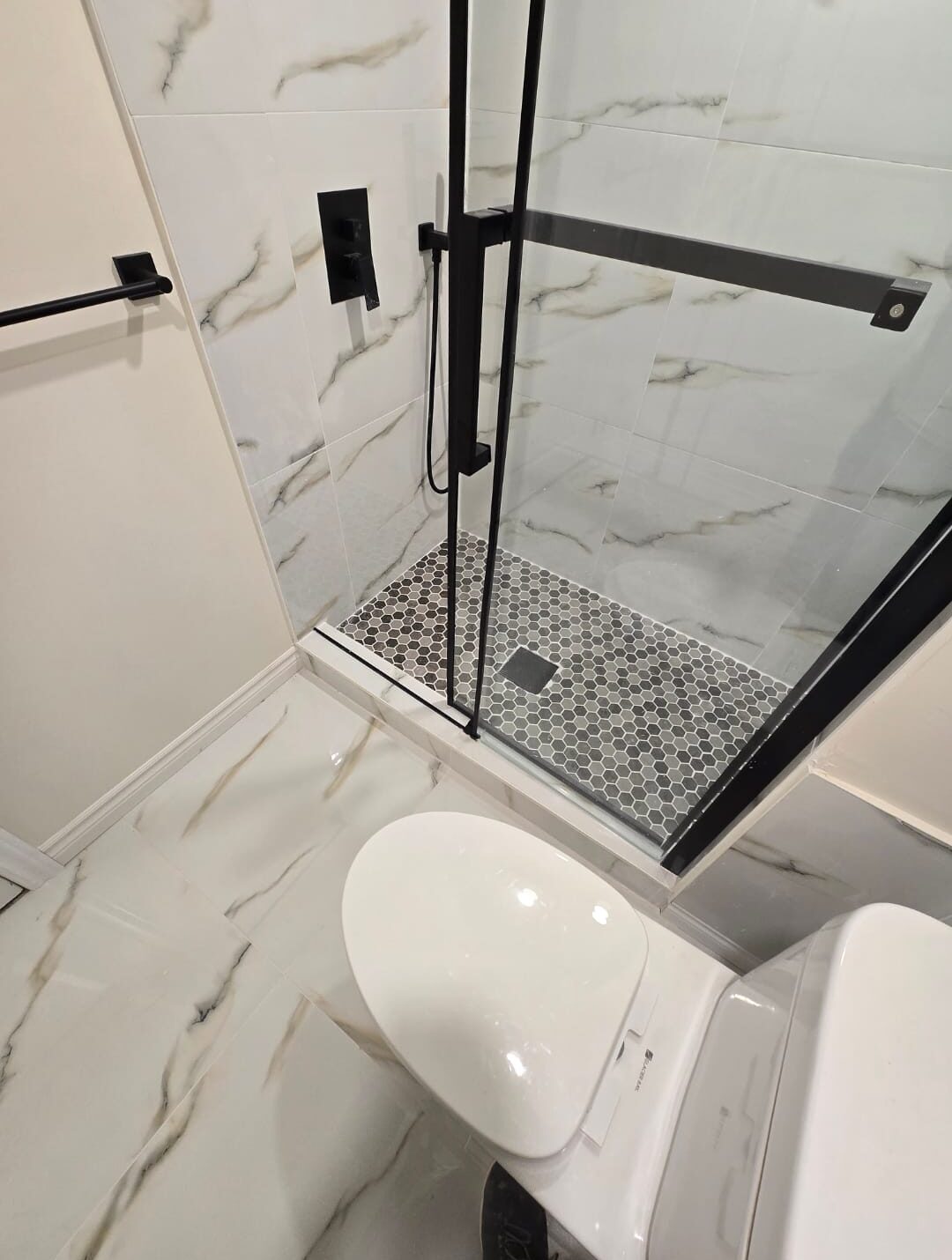 A stunning 3-piece bathroom upgrade with luxury porcelain tiles, a timeless mosaic shower base, and premium fixtures.