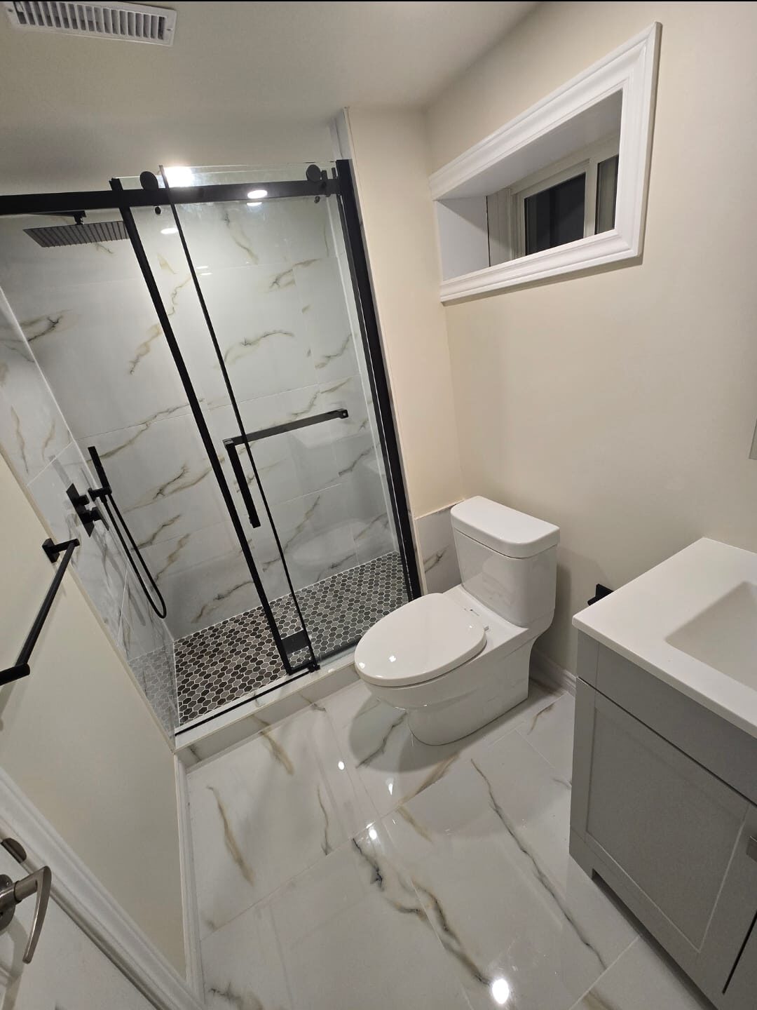 A stunning 3-piece bathroom upgrade with luxury porcelain tiles, and premium fixtures.