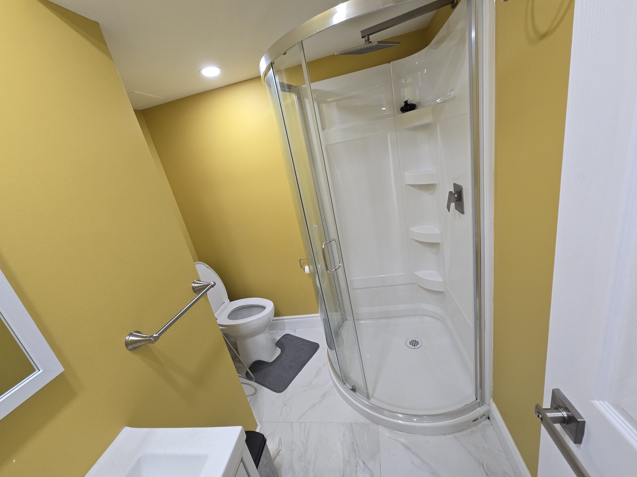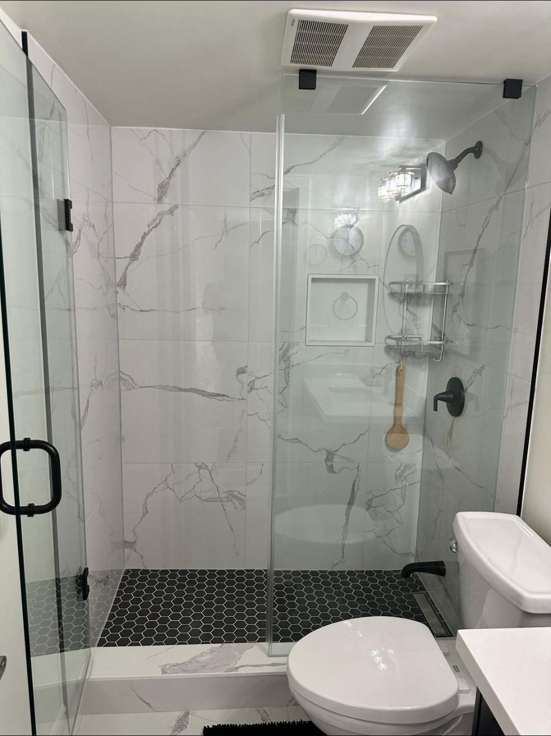 Expert tile installation with waterproofing using the Schluter Kerdi membrane, plus a brand-new toilet and sink for a fresh, modern look.