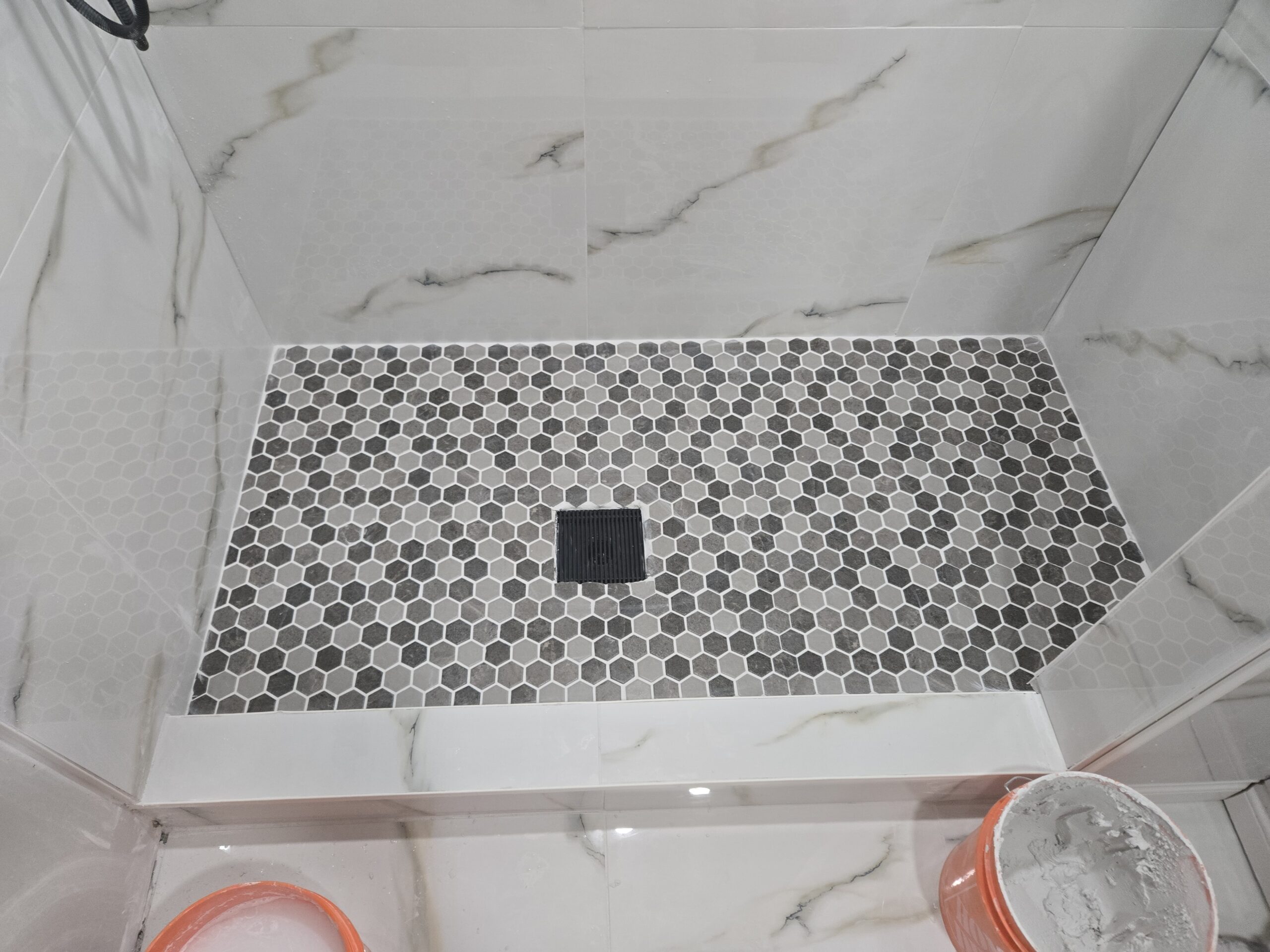 Shower base with mosaic tiles and drain protection for pet hair, installed by Star Inspiration Carpentry.