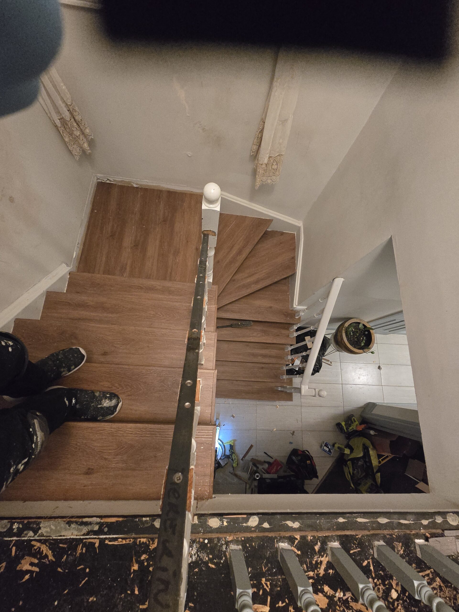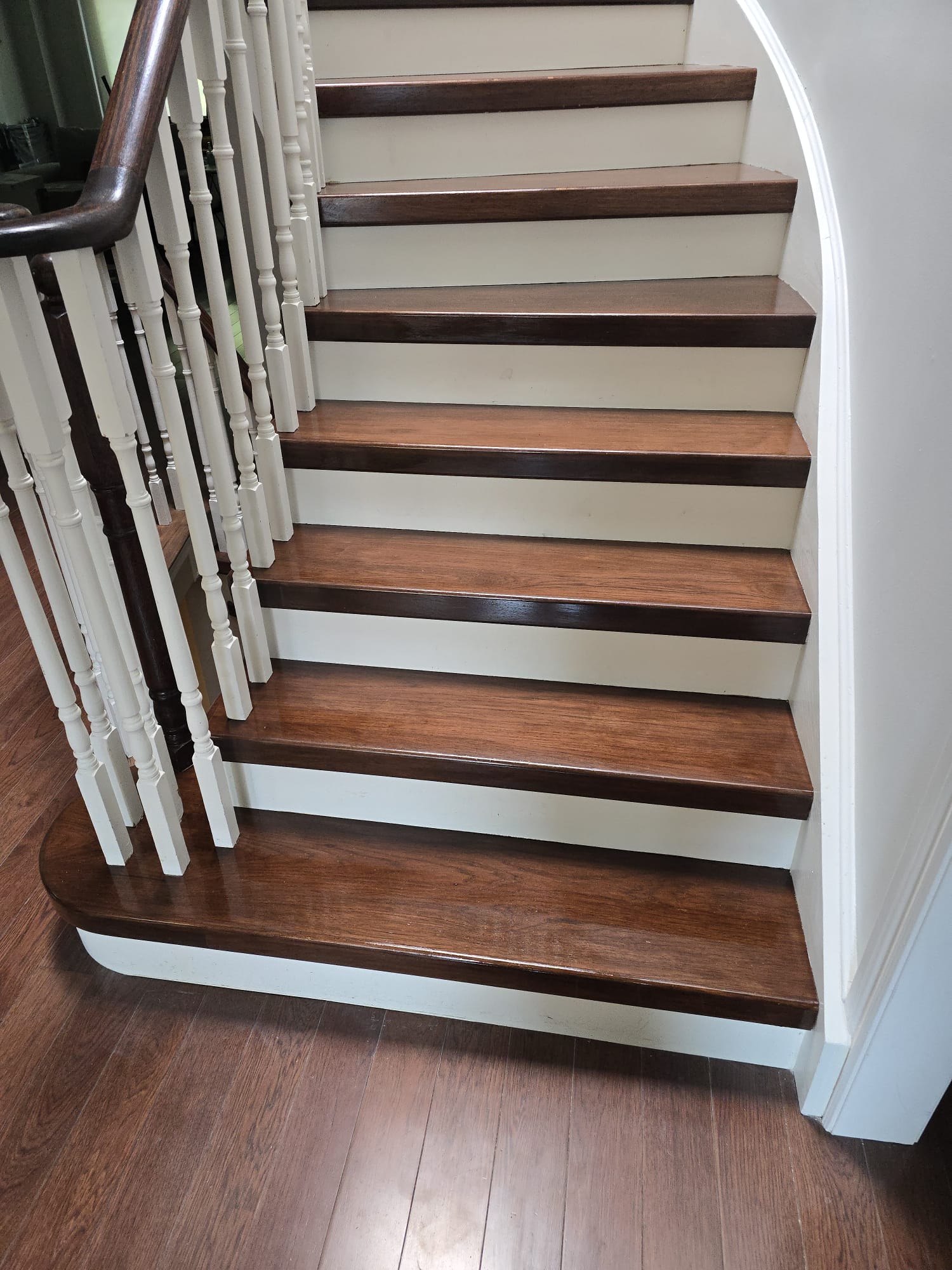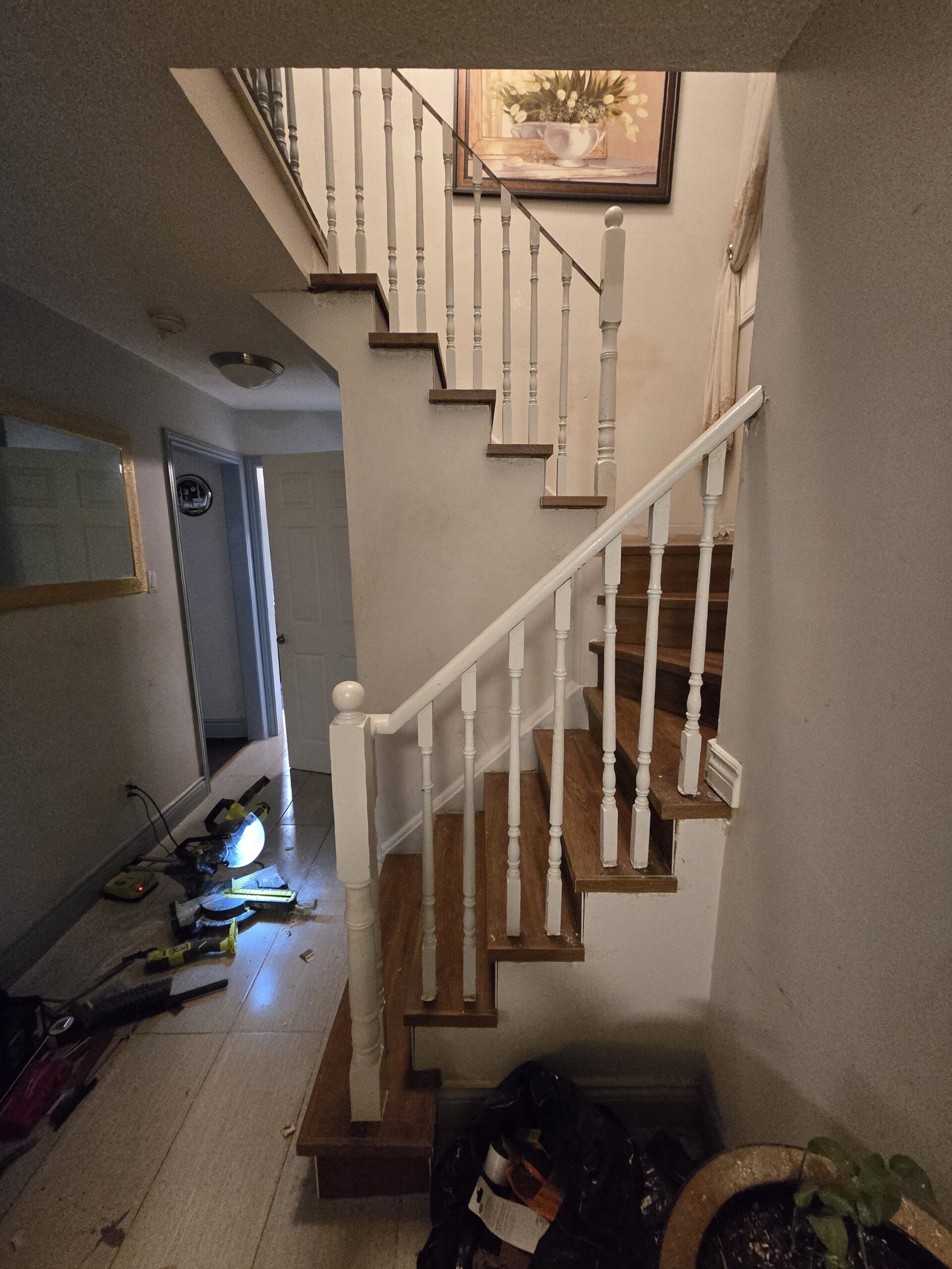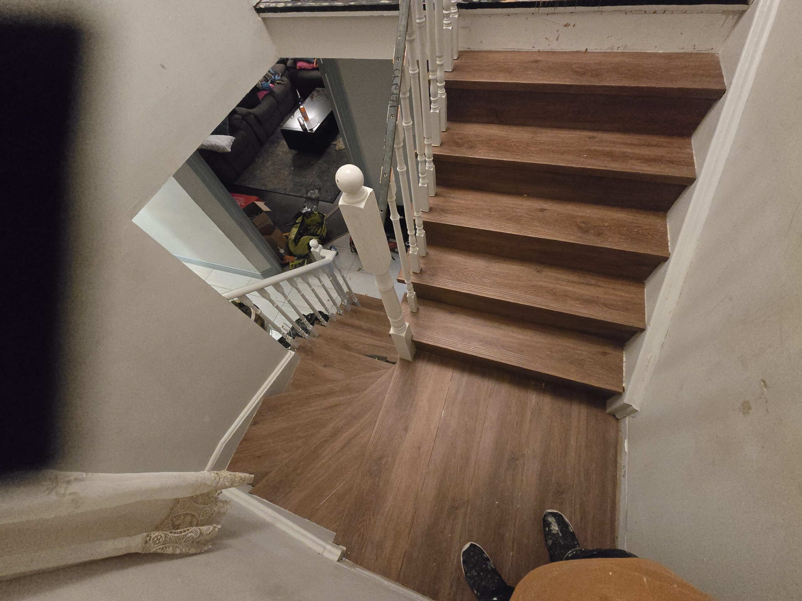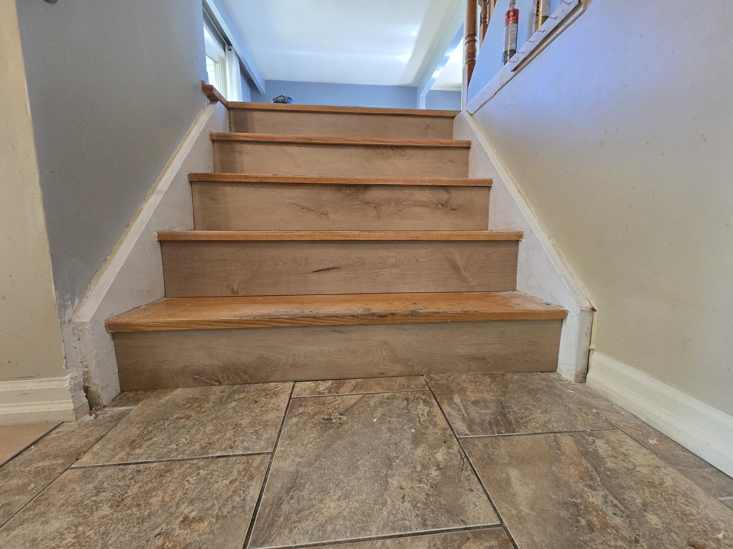 Vinyl stair treads and risers installed over pine wood stairs, featuring slip-resistant properties for enhanced safety. Installed by Star Inspiration Carpentry.