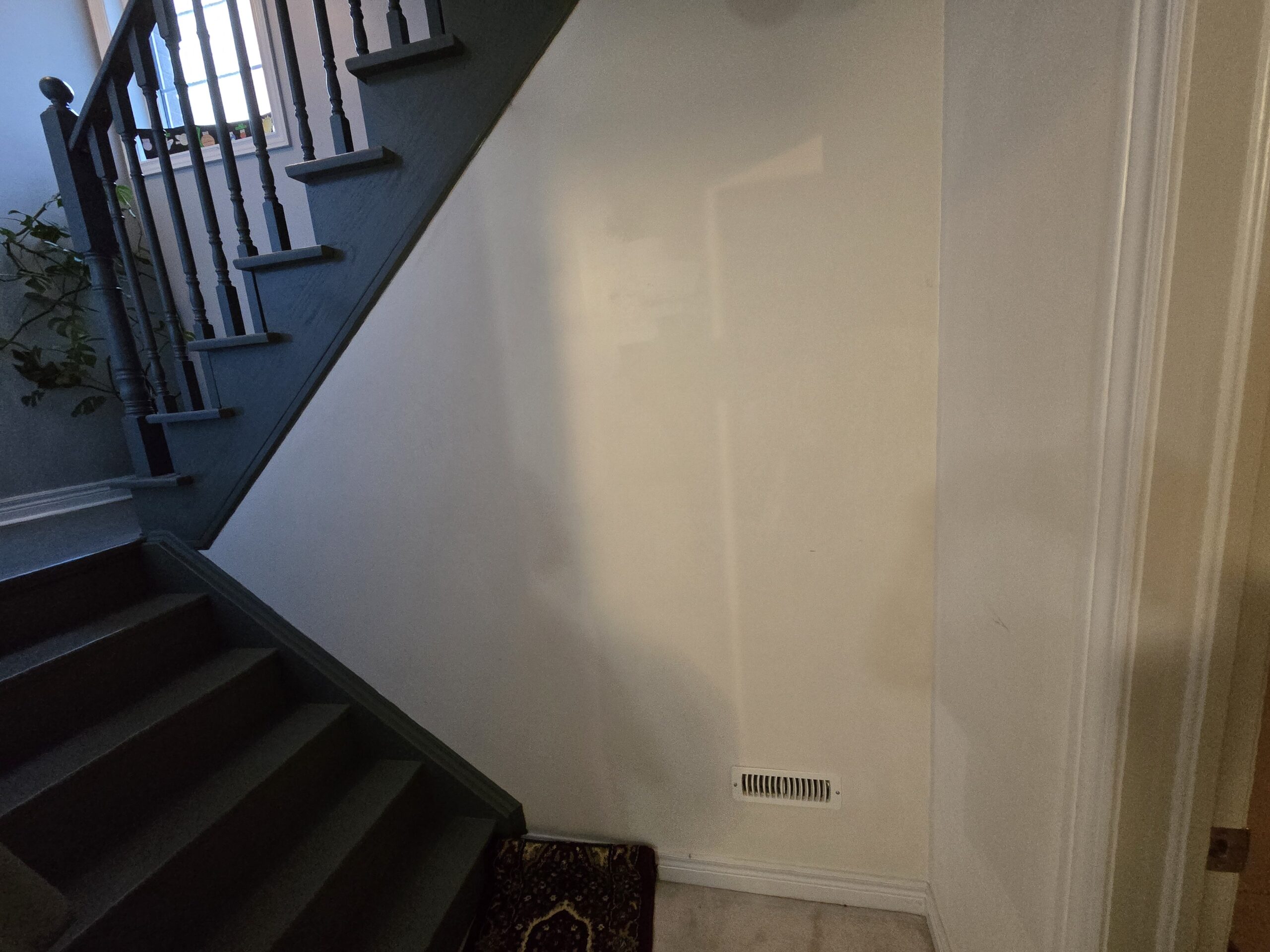 Basement stairs after carpet removal, professionally painted in an elegant dark walnut color for a timeless and sophisticated feel.